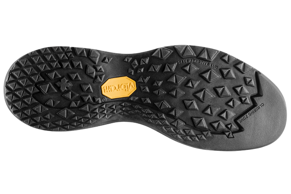 Equipaggiata con suola Vibram® Password, in mescola Megagrip e dotata di climbing zone, offre sensibilità di appoggio, mentre il disegno del battistrada a tappi auto-adattanti è stato progettato per aumentare la trazione e l’adattabilità. I canali di scarico autopulenti facilitano e velocizzano la pulizia dai detriti.